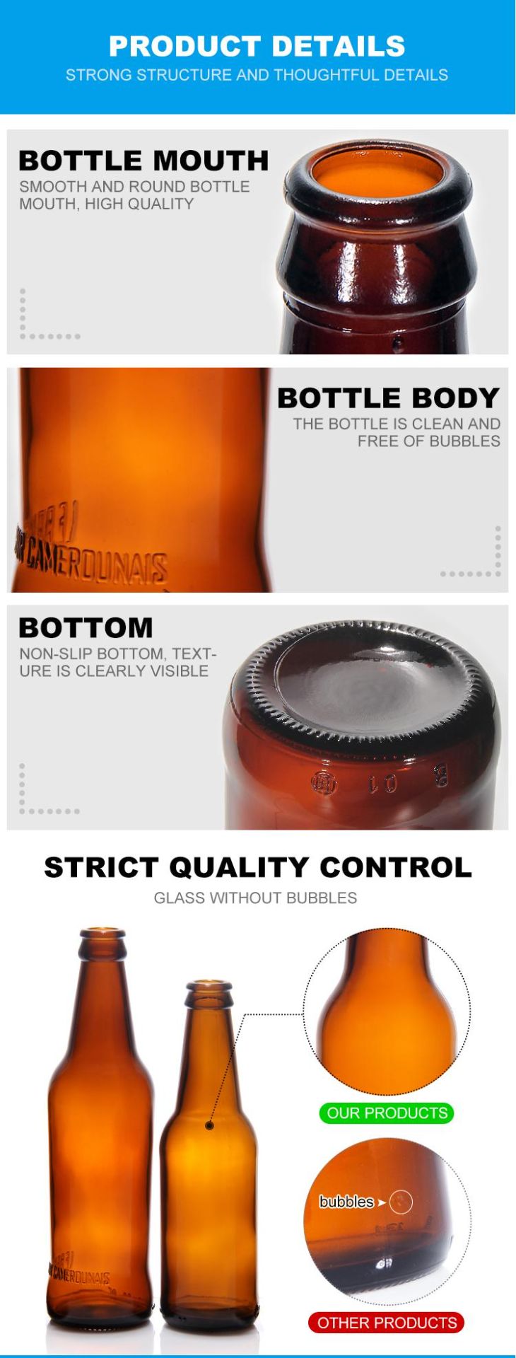 - Strict quality control, 0.2% max broken rate, 1:1 free replacement for defective/broken bottles
