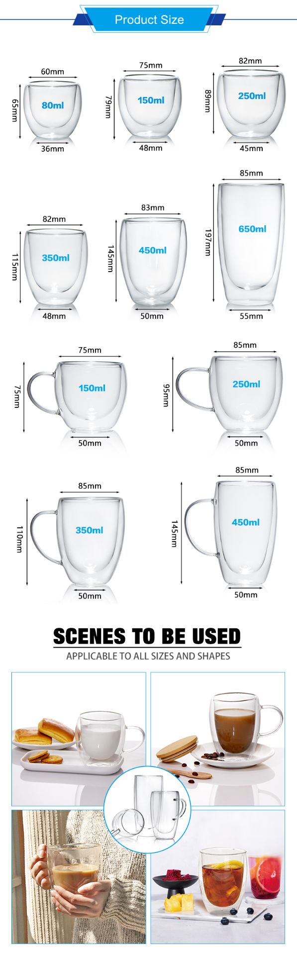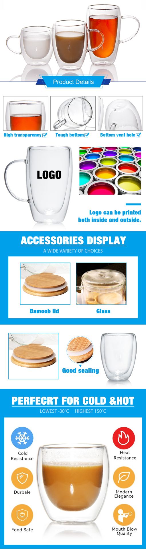 Our Double Wall High Borosilicate Glass Cup is crafted with eco-friendly food-grade glass, featuring extreme temperature resistance from -30°C to 150°C and double wall insulation design to keep drinks hot/cold and prevent scalding. With super high transparency comparable to crystal, this hand-blown glass mug has a tough bottom with vent hole for long-lasting use, and is microwave & dishwasher safe for ultimate convenience.