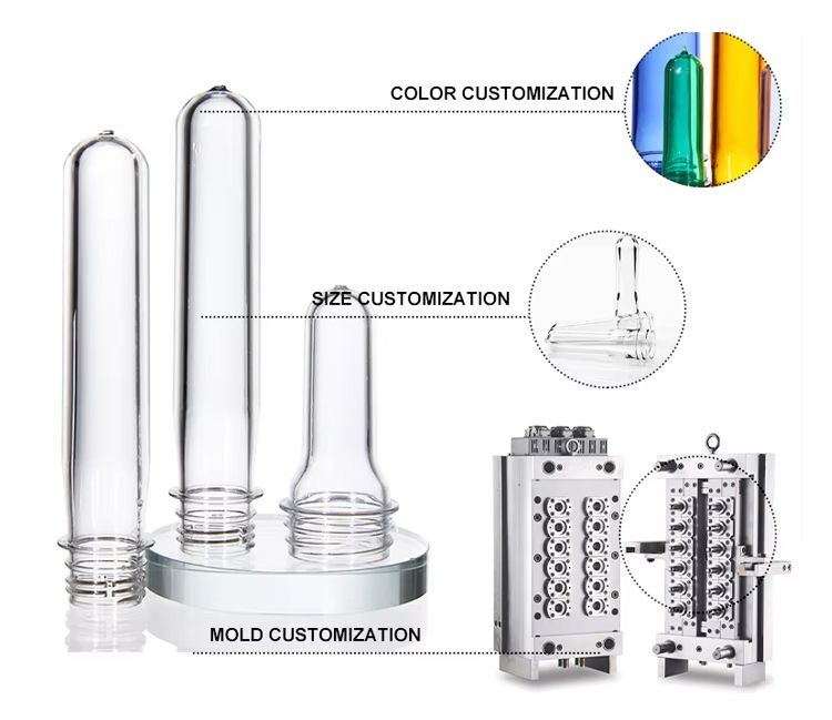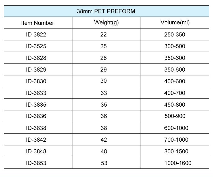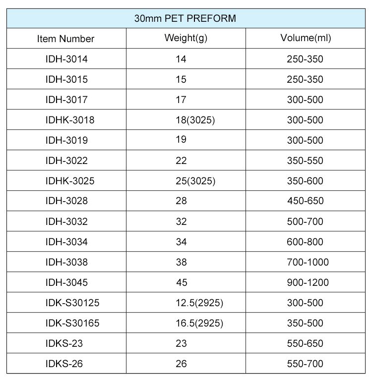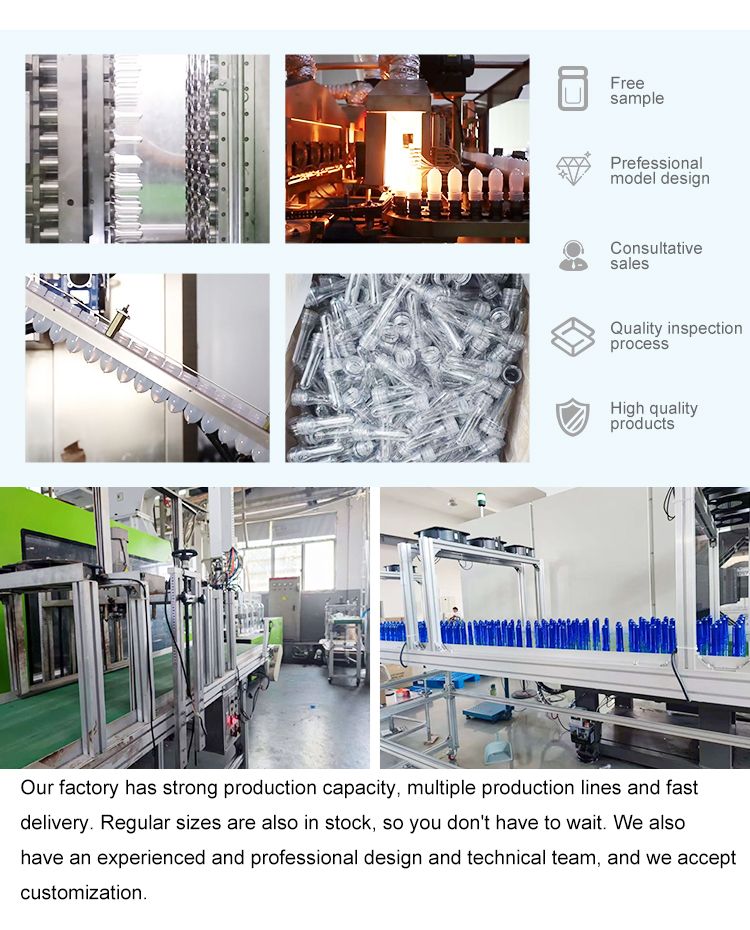 Our BPA Free PET Preform is made of 100% raw food-grade PET material, lead-free and passed food safety testing, suitable for hot filling and all beverage packaging needs. With various neck sizes (28mm/30mm/38mm/45mm/48mm) and weight range 14g-800g, including PCO1881/1810 high/short neck options, it’s the perfect blank for plastic bottle blowing of water, carbonated drinks, juice, tea, milk and energy drinks.