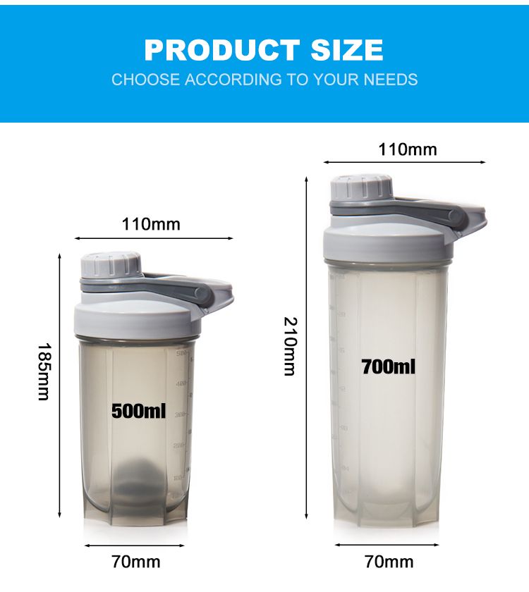 Food-grade BPA-free plastic shaker bottles in 500ml & 700ml. Leak-proof lid, smooth mixing, lightweight & portable. Perfect for protein shakes, water, juice & fitness use. Custom logo & color available. Factory direct with low MOQ & fast lead time.